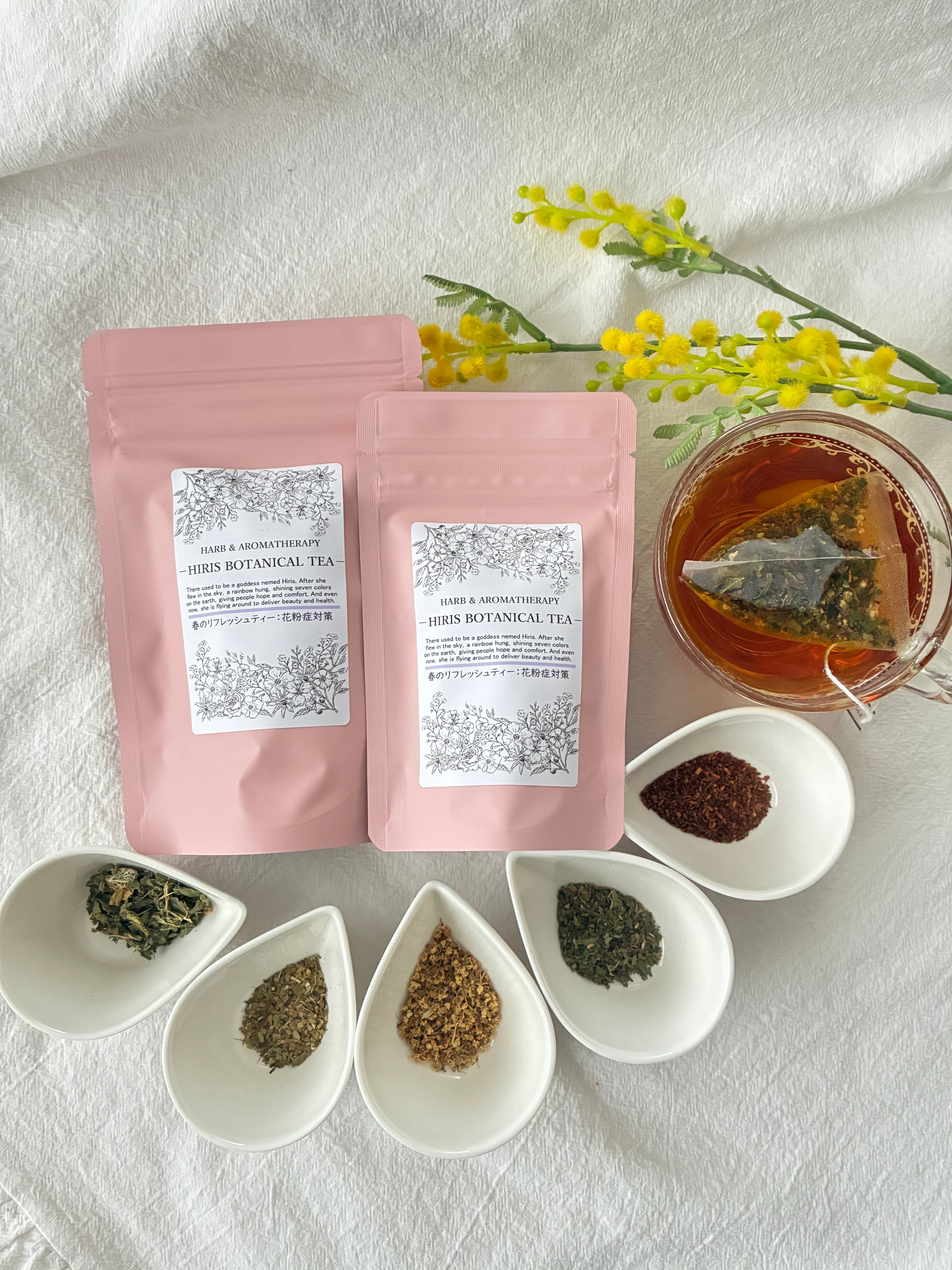 花粉症の症状緩和に役立つ《ネトル》、鼻詰まりや喉の不調をすっきりさせてくれる《ペパーミント》、抗酸化作用が高い《ルイボス》、神経を和らげてくれる《エルダーフラワー》を配合し春に役立つブランドに仕上げました。さらに《マテ》はカフェインを含みますがコーヒー10cc程度で飲むサラダも呼ばれミネラルが豊富です。